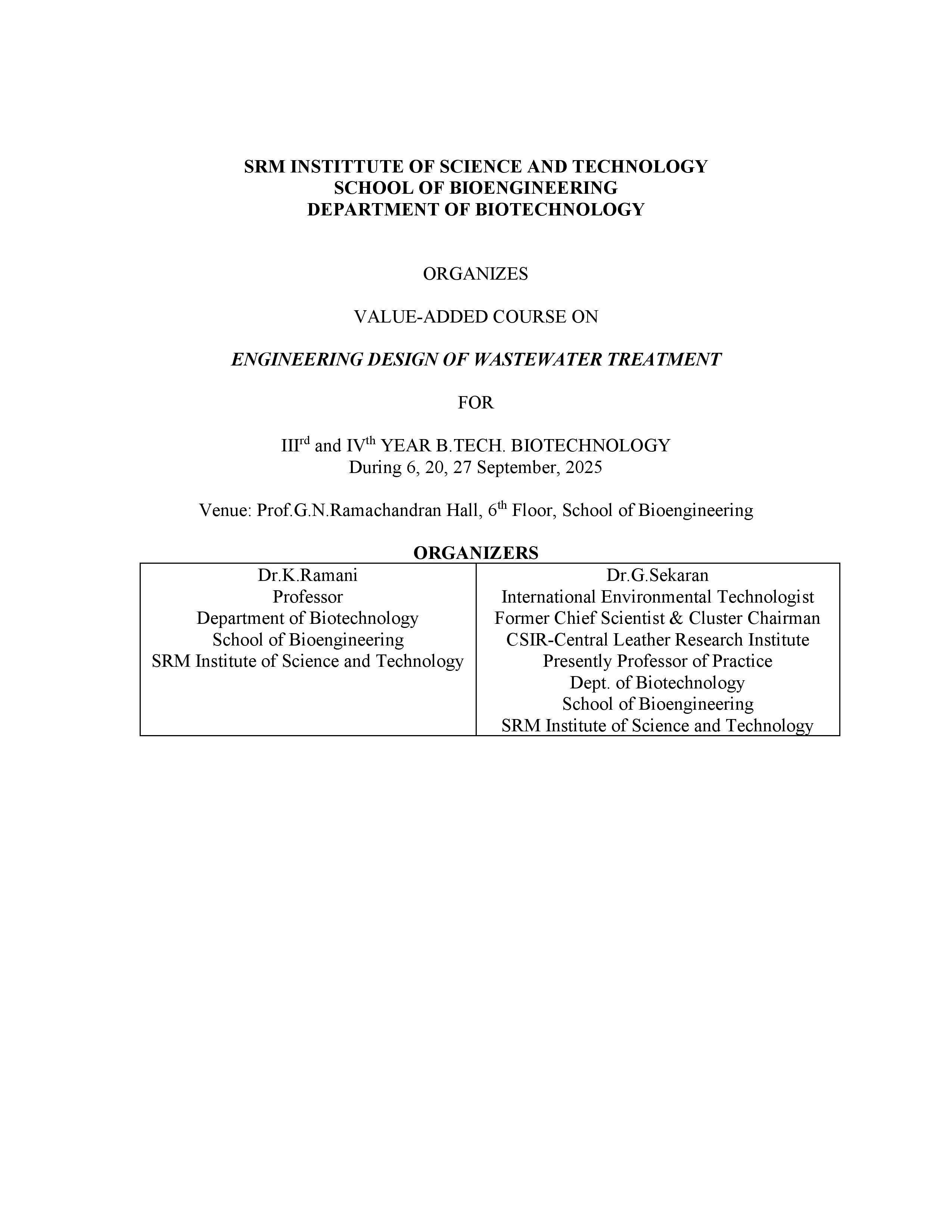 Value-Added Course by Dept.of Biotechnology-Organizer - Dr. K. Ramani