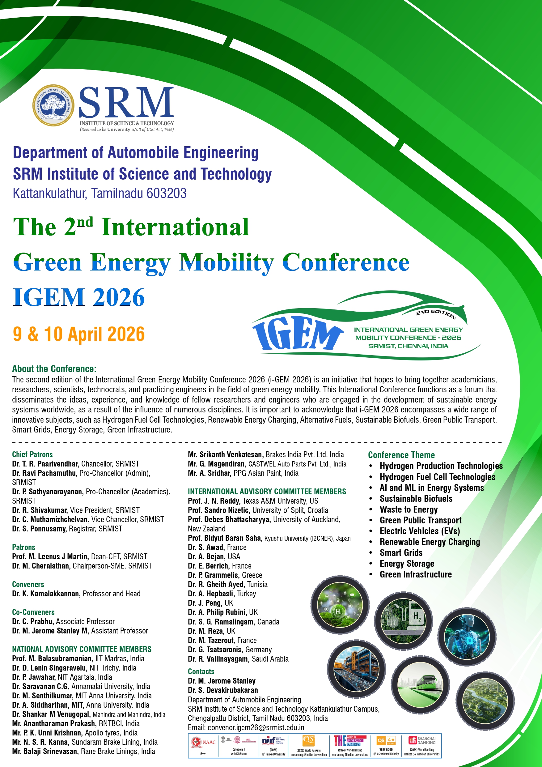 The second edition of the International Green Energy Mobility Conference 2026 (i-GEM 2026) is an initiative that hopes to bring together academicians, researchers, scientists, technocrats, and practicing engineers in the field of green energy mobility. This International Conference functions as a forum that disseminates the ideas, experience, and knowledge of fellow researchers and engineers who are engaged in the development of sustainable energy systems worldwide, as a result of the influence of numerous disciplines. It is important to acknowledge that i-GEM 2026 encompasses a wide range of innovative subjects, such as Hydrogen Fuel Cell Technologies, Renewable Energy Charging, Alternative Fuels, Sustainable Biofuels, Green Public Transport, Smart Grids, Energy Storage, Green Infrastructure