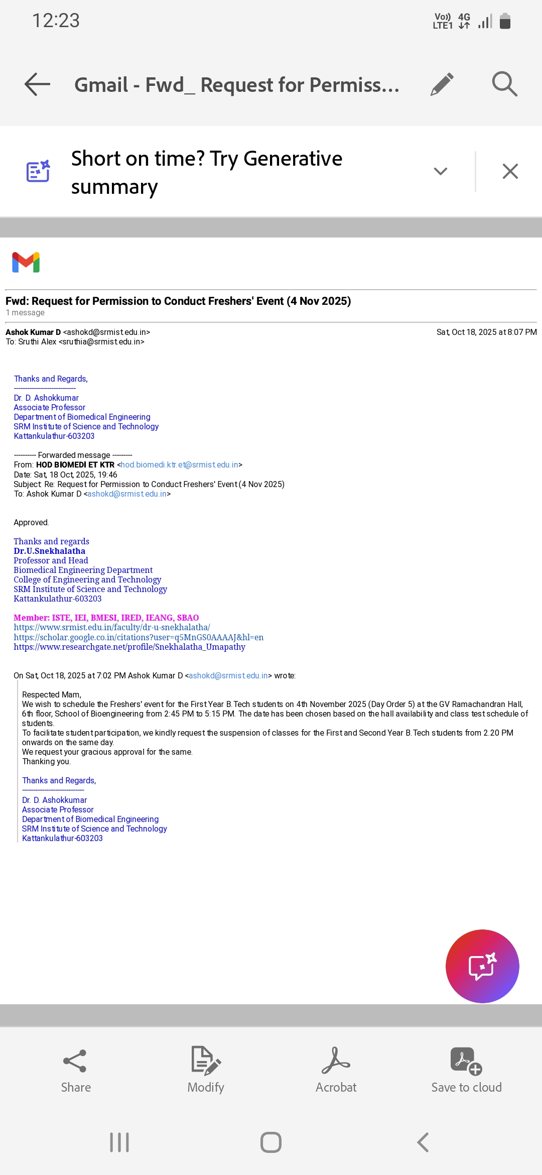 Dr. M. Ramya, Professor, Genetic Engineering Department, SRMIST KTR, ramyam@srmist.edu.in