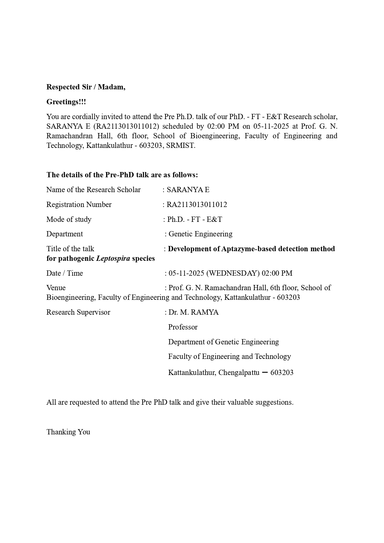 Pre-PhD Talk By Saranya E (RA2113013011012), Development of Aptazyme-based detection method for pathogenic Leptospira species, se3367@srmist.edu.in, Genetic Engineering Department